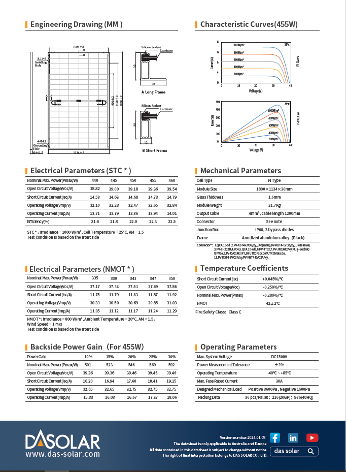 The DAS 440W All-Black Bifacial Solar Panel combines advanced N-Type TOPCon technology and a sleek, double-glass design for exceptional performance and durability. With up to 80% bifaciality, it captures additional energy from the rear side, ensuring maximum energy yield in all lighting conditions.