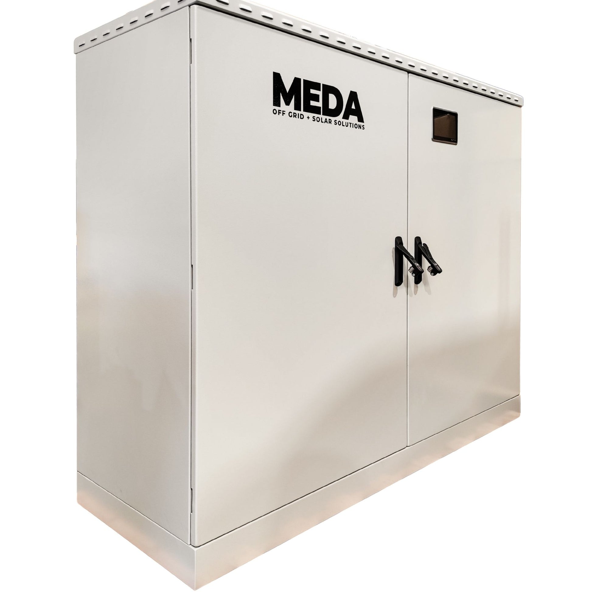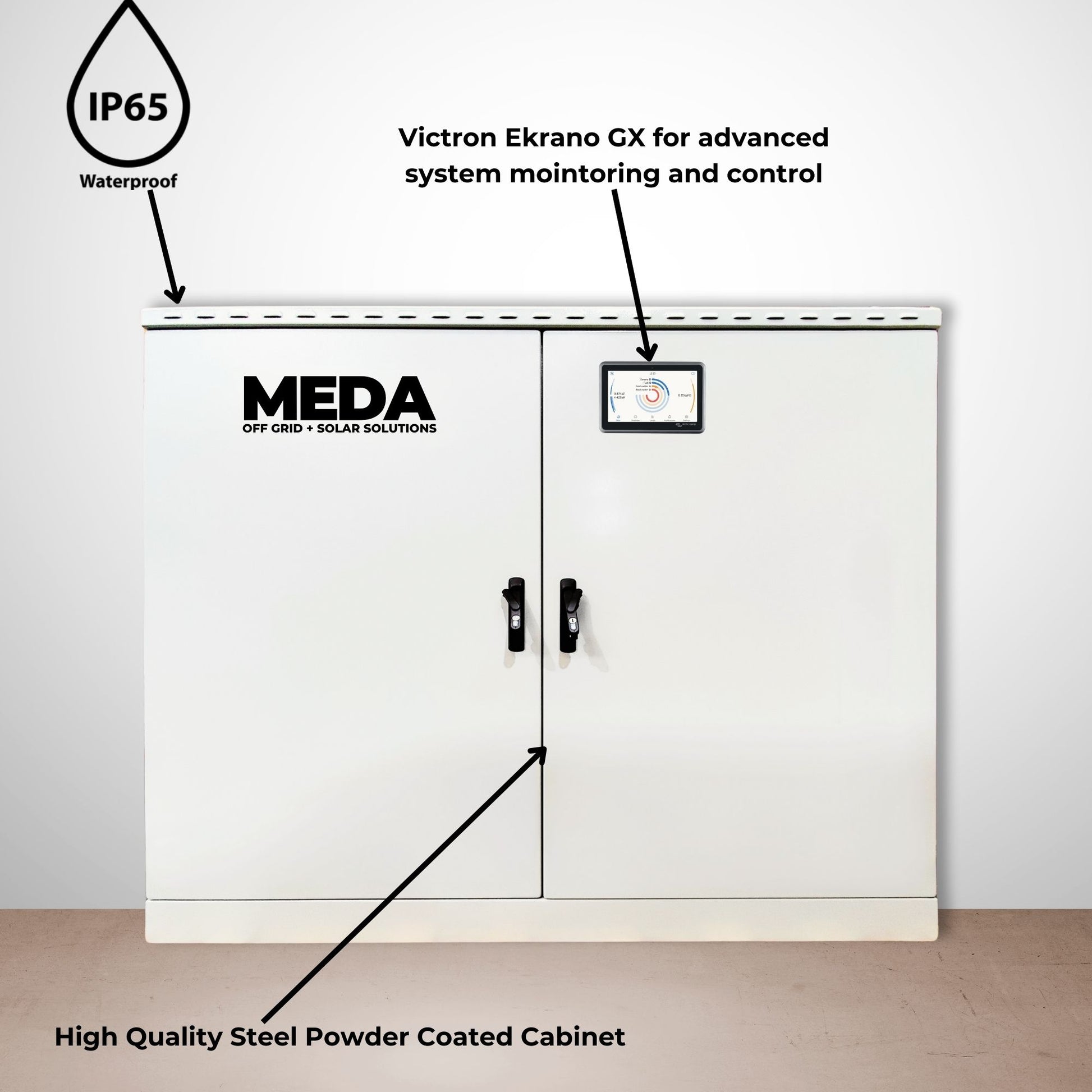 The PowerVault is MEDA’s flagship prebuilt solar cabinet — our most powerful and scalable system to date. Designed to meet the needs of serious off-grid homes, rural properties, and remote commercial setups, it comes fully assembled with premium Victron and Dyness components and is housed in a heavy-duty, IP-rated cabinet.